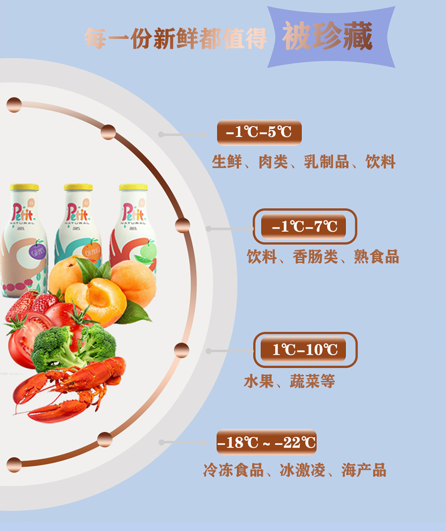 ★運(yùn)行溫度為3M1(-1~5℃),用于展示和銷售海產(chǎn)品、鮮肉類;運(yùn)行溫度為3M2(-1~7℃),用于展示和銷售飲料、奶制品、香腸類、熟食品等日配品。